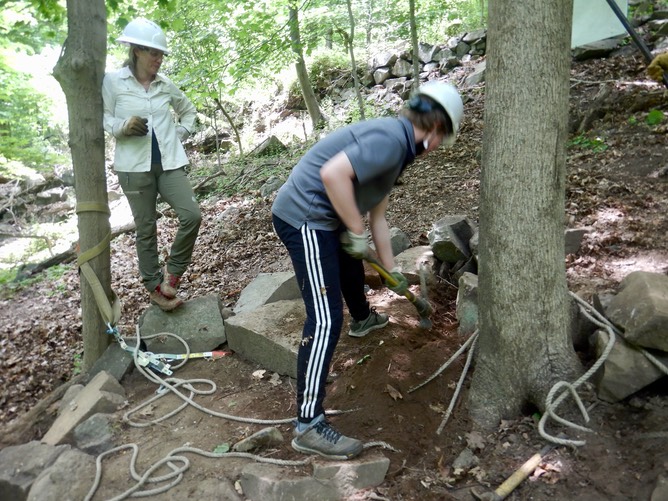 Elijah making a step base using a pick mattock