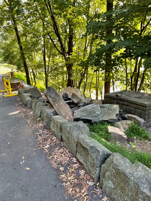 At the Nyack Beach stairs rebuild the Park has made a delivery of big rocks