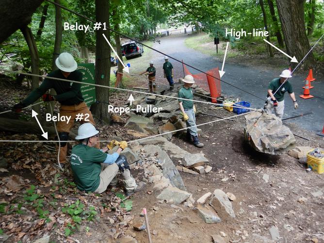 The high-line lifts the rock, belay #1 keeps it from swinging, the rope-puller pulls it uphill and belay #2 holds the rock in case the rope-puller slips